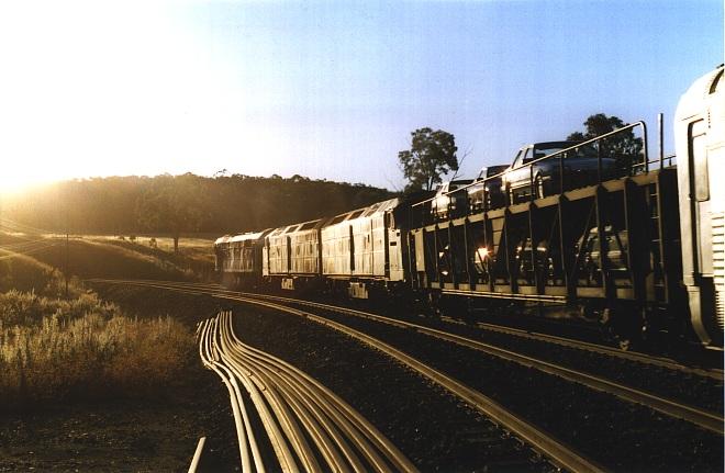 9002, 9008 and 9023 pass the back of their own 84 wagon train at Mt Thorley balloon loop, 26/1/97, (30K) (DJ)